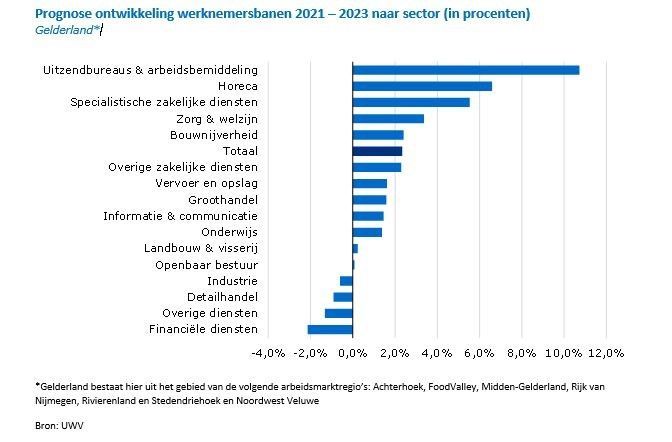 De prognoses gaan uit van banengroei in alle Gelderse regio’s. Tussen 2021 en 2023 groeit de werkgelegenheid het sterkst in de uitzendbranche (+10%) en horeca (+6,6%). De uitzendbranche werd hard getroffen door de coronacrisis, maar maakt nu weer een sterke groei door. Dit past bij een herstellende economie en toch ook wat onzekere tijden waarin bedrijven uitzendbureaus inschakelen om personeel te werven. In Gelderland komt het aantal uitzendbanen weer op het niveau van voor corona. Ook in de horeca stijgt de werkgelegenheid dit en volgend jaar verder. Naar verwachting blijft het aantal banen in de horeca in alle Gelderse regio’s echter nog onder het niveau van voor de coronacrisis.